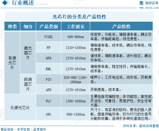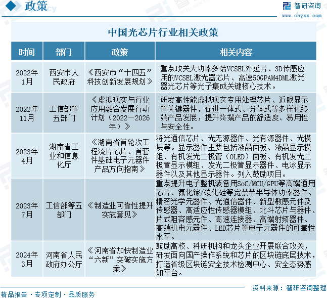 光芯片目前已广泛应用于通信、工业、消费、照明等领域,下游市场不断拓展。受益于信息应用流量需求的增长和光通信技术的升级,光模块作为光通信产业链最为重要的器件保持持续增长,光芯片作为光模块核心元件有望持续受益。近年来,国家及各地方政府相继出台政策扶持中国光芯片行业的发展。例如,2023年7月,工信部等五部门印发《制造业可靠性提升实施意见》,提出要重点提升电子整机装备用SoC/MCU/GPU等高端通用芯片、氮化镓/碳化硅等宽禁带半导体功率器件、精密光学元器件、光通信器件、新型敏感元件及传感器、高适应性传感器模组、北斗芯片与器件、片式阻容感元件、高速连接器、高端射频器件、高端机电元器件、LED芯片等电子元器件的可靠性水平。2024年3月,河南省人民政府办公厅印发《河南省加快制造业“六新”突破实施方案》,提出要鼓励高校、科研机构和龙头企业开展联合攻关,研发面向国产操作系统和芯片的区块链底层技术,打造省级区块链安全技术检测中心、安全态势感知平台。