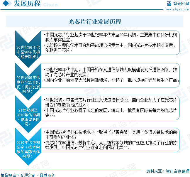 中国光芯片行业始于20世纪80年代末至90年代初的起步阶段,经历了初步发展、快速增长、技术突破和国际合作等阶段,近年来逐步走向国际化舞台。随着政策支持和市场需求的不断增长,中国光芯片行业正迈向更广阔的未来,将继续在全球光通信和高科技领域发挥重要作用。