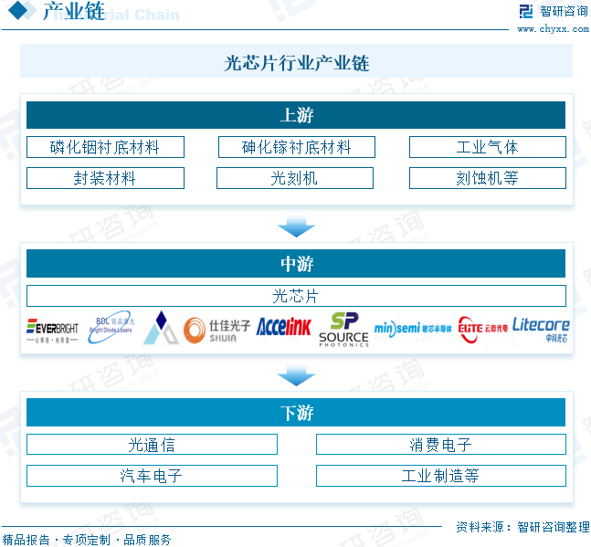 中国光芯片产业链上游包括磷化铟衬底材料、砷化镓衬底材料、工业气体、封装材料、光刻机、刻蚀机等;中游为光芯片,可分为有源光器件芯片及无源光器件芯片;下游应用光通信、消费电子、汽车电子、工业制造、医疗等领域。