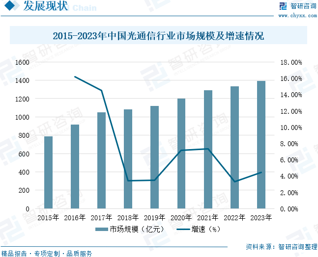 随着云计算、大数据、物联网、人工智能等新一代信息技术快速发展,全球数据流量呈爆发式增长,互联网数据中心建设成为大势所趋。此外,数据中心作为光通信行业的另一重要应用领域,近年来在世界主要国家和大型企业数字化转型的带动下发展迅速。光通信行业是5G网络建设和数据中心搭建的基础,在下游需求扩张的推动下,其行业将保持稳步增长态势。数据显示,2023年我国光通信市场规模达到1390亿元,同比增长4.43%。光芯片作为光通信和光模块的重要组成部分,随着光通信行业的发展和应用场景的变化,光芯片行业将加速发展。