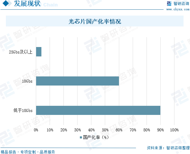 目前,国内光芯片相关企业仅在2.5G和10G光芯片领域实现核心技术的掌握,高端光芯片国产替代率仍较低。2.5G及以下速率光芯片国产化率约90%;10G光芯片国产化率约60%,部分性能要求较高、难度较大。10G光芯片仍需进口;25G光芯片国产化率约20%,但25G以上光芯片的国产化率仅5%,仍以海外光芯片厂商为主,未来国产化的提升潜力广阔。