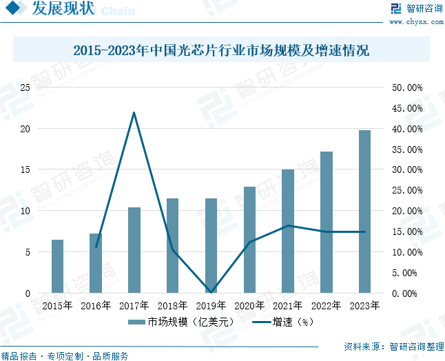 随着通信技术的飞速发展,光芯片市场在全球范围内呈现出强劲的增长势头,这主要得益于下游应用领域对高速、高带宽、低延迟通信的需求不断增加。例如,在数据中心和云计算领域,高密度、高性能的光互连解决方案已经成为基础设施的核心,光芯片在这些领域中的应用占比不断上升。近年来,中国光芯片行业市场规模整体呈现逐年增长的态势。数据显示,中国光芯片行业市场规模从2015年的5.56亿美元增长至2023年的19.74亿美元,年复合增长率为17.16%。未来几年5G设备升级和相关应用落地将会持续进行,同时大量数据中心设备更新和新数据中心落地也会持续助力光芯片市场规模的增长。