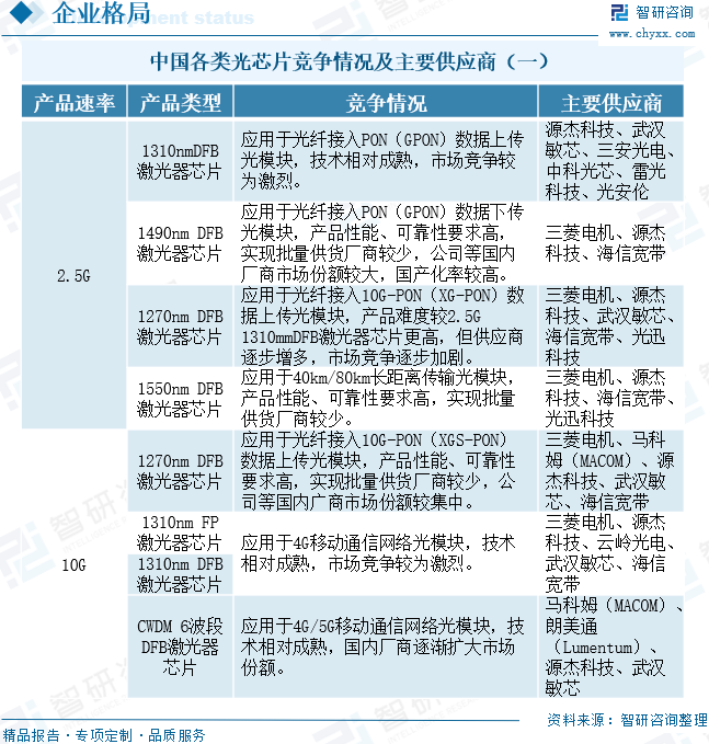 国内专业光芯片厂商包括源杰科技、武汉敏芯、中科光芯、雷光科技、光安伦、云岭光电等。国内综合光芯片模块厂商或拥有独立光芯片业务板块厂商包括光迅科技、海信宽带、索尔思、三安光电、仕佳光子等。目前国内光芯片企业正在积极开发25G光芯片产品,源杰科技、光迅科技、仕佳光子、海信宽带等企业都有相关业务布局。