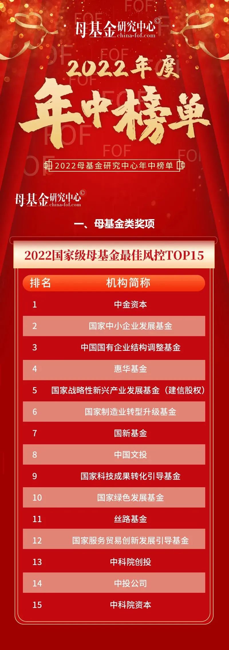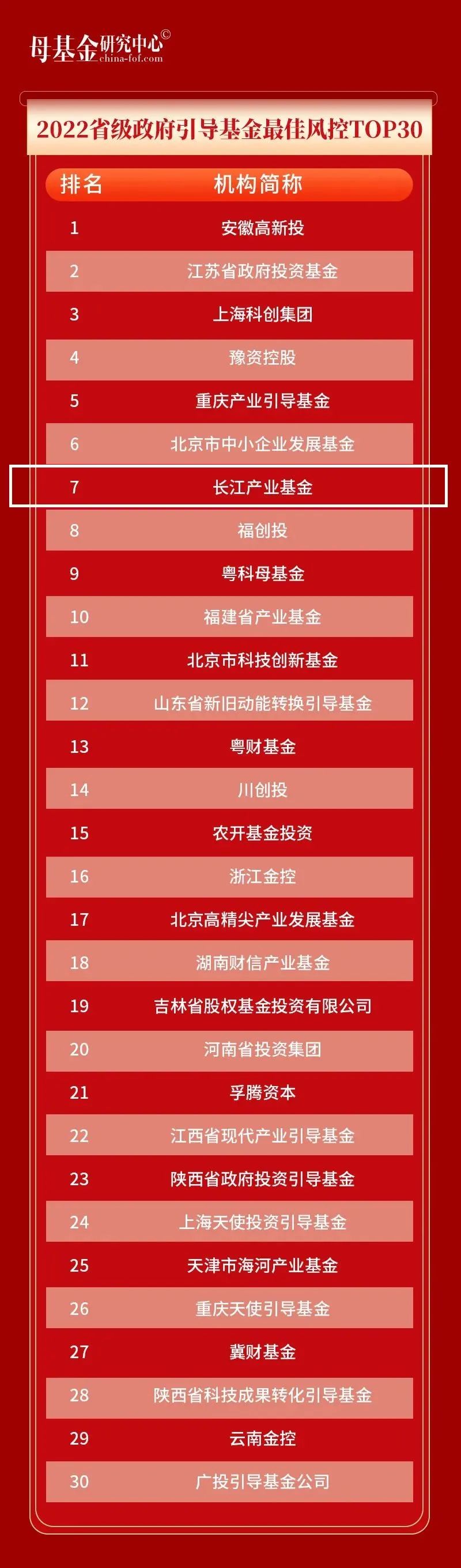 7月31日,母基金研究中心2022年度年中榜单正式揭晓, 长江产业基金凭借持续稳健高效运营以及在母基金行业的优秀表现,荣获“2022省级政府引导基金最佳风控TOP30”第七名。此次年中榜单还公布了“2022国资直投机构最佳回报TOP20”、“2022最佳回报国资直投投资人TOP20”等奖项获奖名单。该榜单为母基金研究中心基于现有的数据支撑与研究分析评选得出,以此鼓励母基金行业的优秀机构,促进股权投资行业健康发展。
