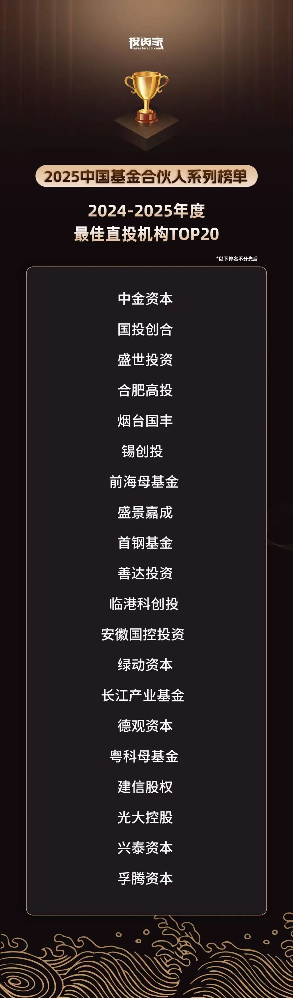 近日,长江产投公司在股权投资领域传来捷报——成功斩获两大行业荣誉,分别入选投资家研究院“2024-2025年度最佳直投机构 TOP20”,以及母基金周刊“2025 新质生产力投资机构软实力排行榜LP活跃100”,以亮眼成绩彰显行业认可度。